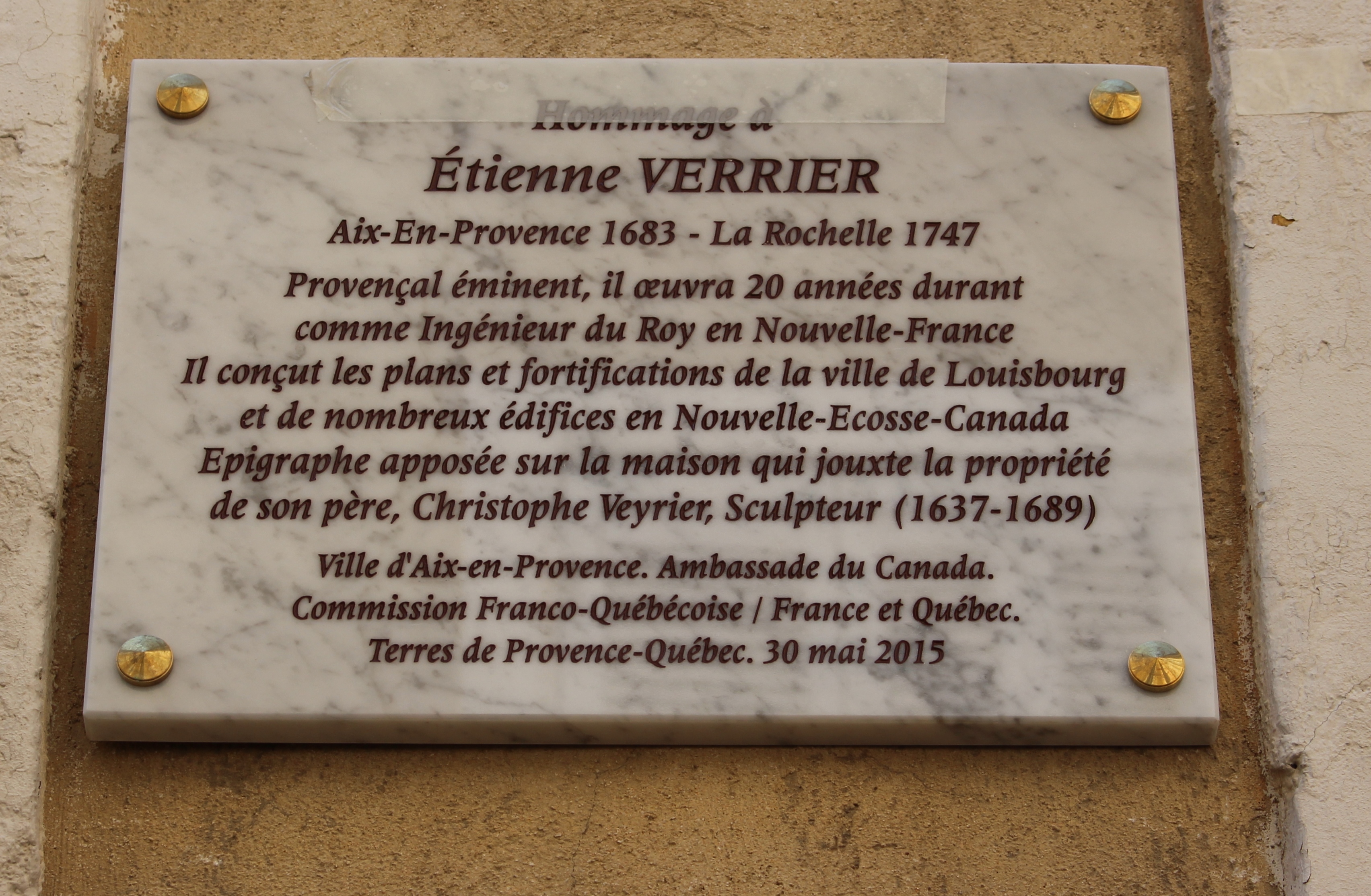 Après l’inauguration d’une plaque commémorative dans la rue Roux-Alphéran à Aix-en-Provence en fin de matinée, organisée conjointement par la ville et l’association Terre de Provence – Québec, la journée du 30 mai 2015 s’est clôturée par le vernissage, à Trets, de l’exposition « De la Provence à la Nouvelle-France » consacrée à l’ingénieur du roi Etienne Verrier (1683-1747).